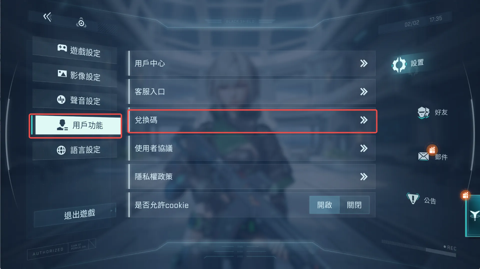 在「鐳明閃擊」遊戲主介面點選設定按鈕 → 選擇使用者功能後點選兌換碼按鈕 → 輸入兌換碼後,獎勵會透過電子郵件發放