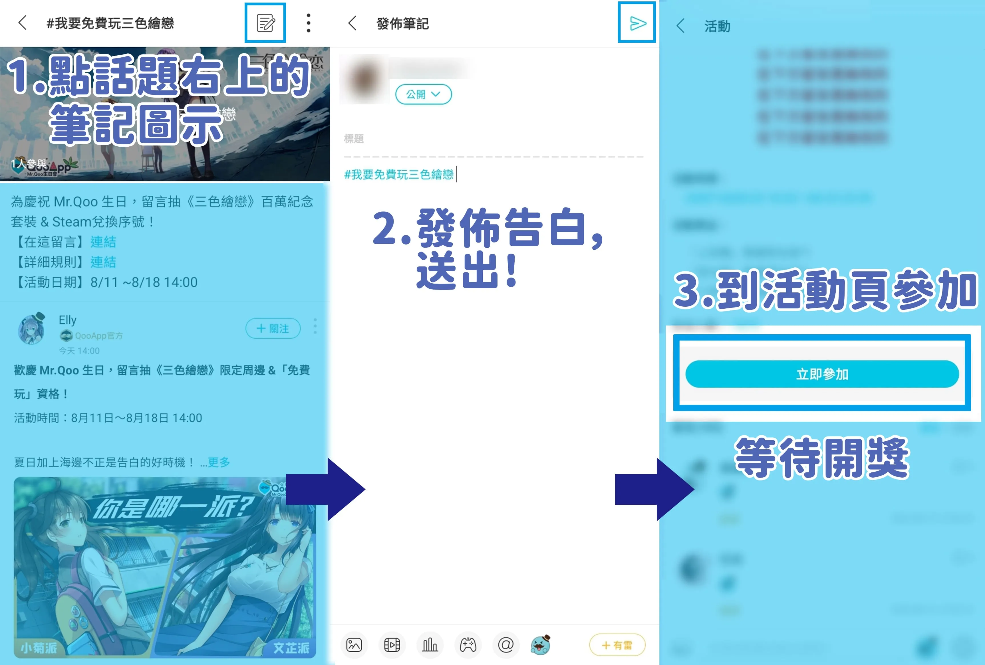 活動期間需在指定筆記留言或在「#我要免費玩三色繪戀」中發佈筆記,方可取得抽獎資格;